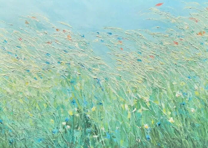 ‘Deze is bedacht door een klein meisje die vond dat die klaproosjes leken op kusjes in de lucht. Je kunt het schilderij kantelen en het beeld blijft hetzelfde, alsof je in het gras ligt en naar boven kijkt naar de lucht.’