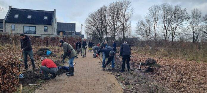 Liesbeth Rischen: ‘Het was een dag van samen werken én ontmoeten. Vrijwilligers hielpen elkaar bij het berekenen van de plantafstand, het graven en het stuk voor stuk inplanten van elke haag. Tussendoor werden verhalen gedeeld, nieuwe contacten gelegd, genoten van soep en cake. Kinderen hielpen vrolijk lachend fanatiek mee met het verspreiden van houtsnippers. Hun energie werkte aanstekelijk en zorgde voor een vrolijke noot door het hele park. Er werd hard en snel gewerkt.’