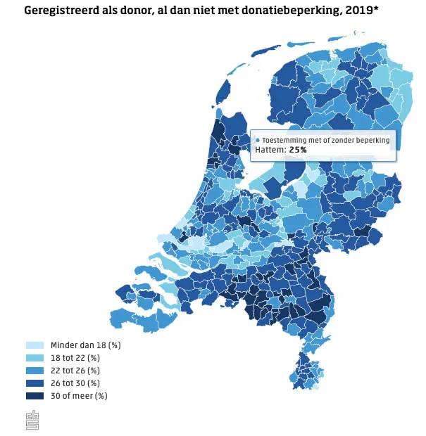 Er zijn regionale verschillen in het aandeel mensen dat toestemming heeft gegeven voor orgaandonatie, al dan niet met donatiebeperking. De gemeente Hattem behoort met 25% tot de middenmoot. InΒ 21 gemeentenΒ staat meer danΒ 30 procentΒ van de bevolking van 12 jaar of ouder geregistreerd als donor. De top drie bestaat uit GoirleΒ (34 procent), Hilvarenbeek en Oost-GelreΒ (33 procent). Daarnaast zijn naast Nijmegen en Horst aan de Maas, relatief veel inwoners van gemeenten in Noord-Brabant die zich als orgaandonor hebben geregistreerd. De gemeenten met het laagste aandeel geregistreerde donoren zijn Urk (9 procent), StaphorstΒ (13 procent)Β en Neder-BetuweΒ (14 procent).