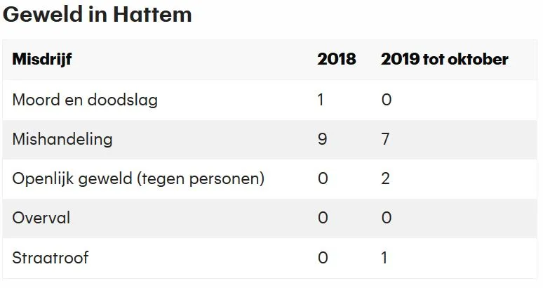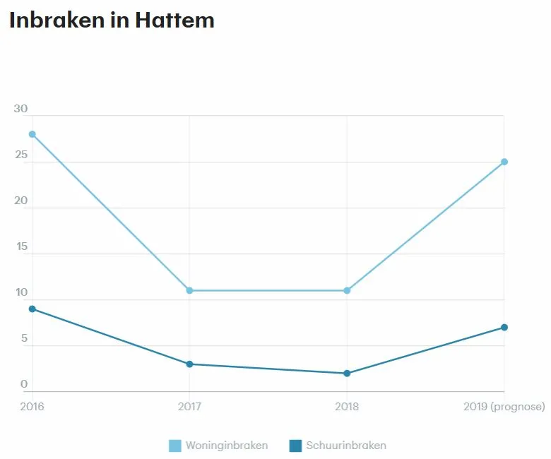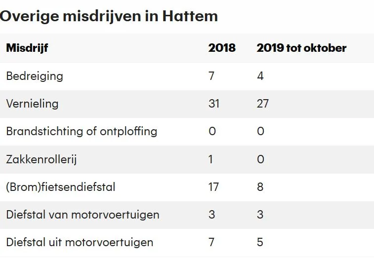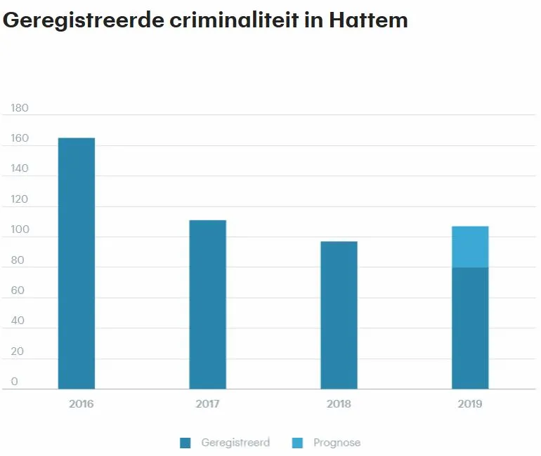 De politie heeft in de eerste negen maanden van 2019 in Hattem 80 veelvoorkomende misdrijven geteld. De verwachting is dat de criminaliteit over heel 2019 zal stijgen ten opzichte van vorig jaar. Dat blijkt uit een analyse van RTL Nieuws op basis van cijfers van de politie. De onderzoeksredactie bekeek daarvoor zestien veelvoorkomende delicten die in elke straat in Nederland kunnen gebeuren. De meest recente gegevens zijn compleet tot en met september 2019, daarom is voor de rest van het jaar een prognose gemaakt.