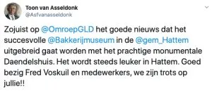 Burgemeester Van Asseldonk twitterde vanmorgen al trots over de uitbreiding van het museum en feliciteert Fred Voskuil en zijn medewerkers.