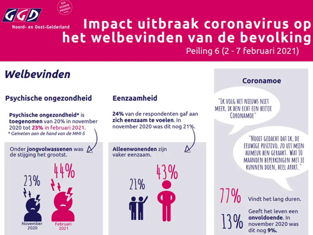 Het aandeel mensen met psychische ongezondheid is toegenomen van 15% in april tot 23% in februari. De sterkste toename -van 23% in april tot 44% in februari- is bij jongvolwassenen. Ook onder alleenwonenden is de toename sterker dan gemiddeld. Zo geeft een mannelijke respondent van 43 jaar aan: “Omdat ik alléén ben en vanuit thuis werk, beginnen de muren letterlijk op mij af te komen. Ik mis de sociale contacten enorm.”