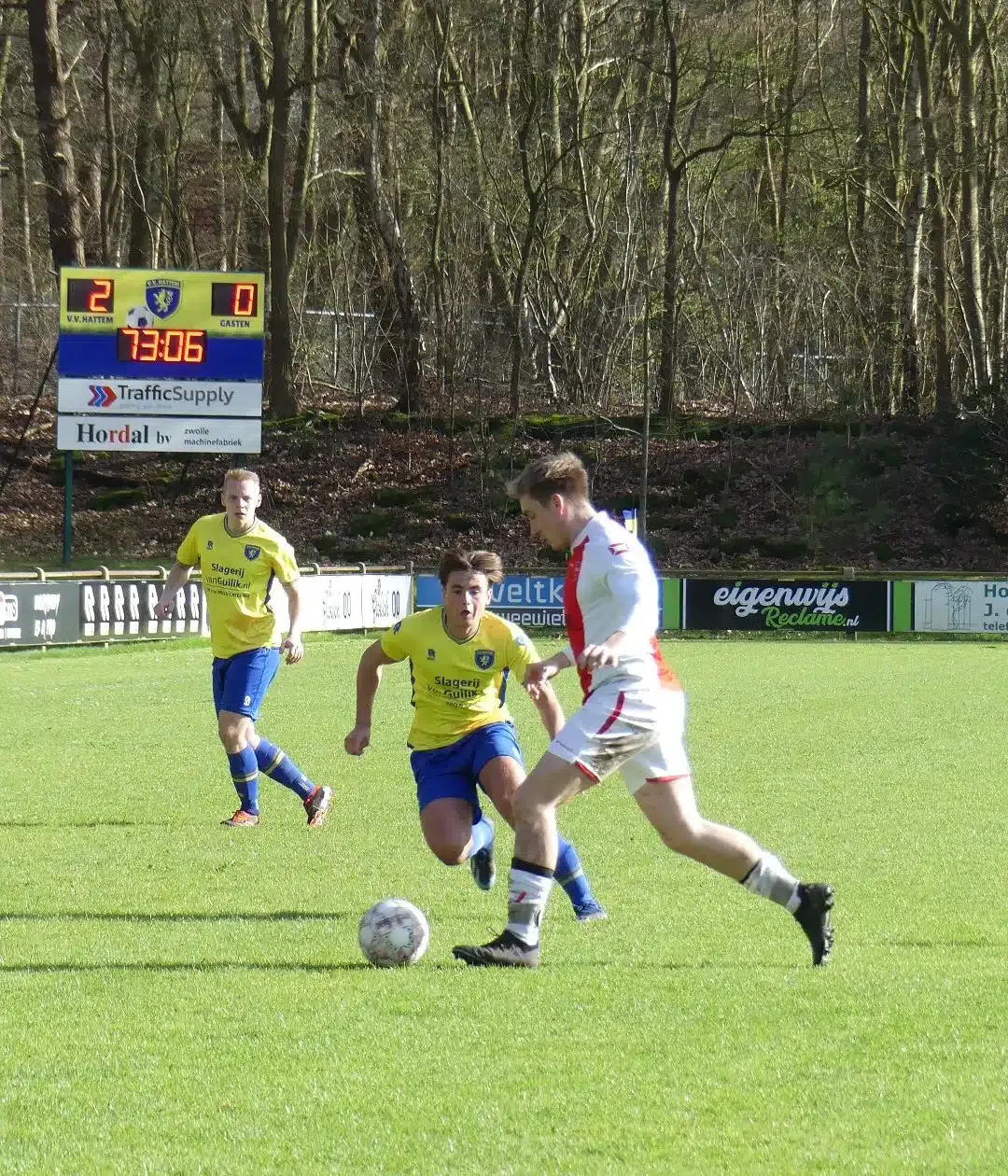Logischerwijs probeert Oene na de rust wat opportunistischer te spelen en op zoek te gaan naar de aansluitingstreffer. Zij heeft dan wel meer de bal, maar tot echt gevaar voor de Hattem-defensie lijdt niet vooralsnog niet. Daarbij is ook doelman Alec van Dijk een zekere sluitpost. Hattem op haar beurt probeert wel op zoek te gaan naar een derde treffer, maar hiervoor is het bij de mogelijkheden die het krijgt wat te gemakzuchtig. Discutabel moment halverwege de tweede helft wanneer Wesley van Winsum binnen de beruchte lijnen onderuit gaat, al dan niet aangetikt. De scheidsrechter ziet hier niets in en laat doorspelen. Met nog zo’n 10 minuten te spelen lijkt Oene het geloof in een goed resultaat te verliezen al heeft het via Mosterd in minuut 83 nog een dot van een kans. Gelukkig voor Hattem gaat de bal hoog over het doel. In de slotfase maakt de Hattem-verdediging niet altijd even de goede keuzes maar komt het verder niet meer echt in de problemen. Hattem kan ook in deze wedstrijd weer drie punten bijschrijven en dat is zeker belangrijk gezien de stand van de ranglijst.