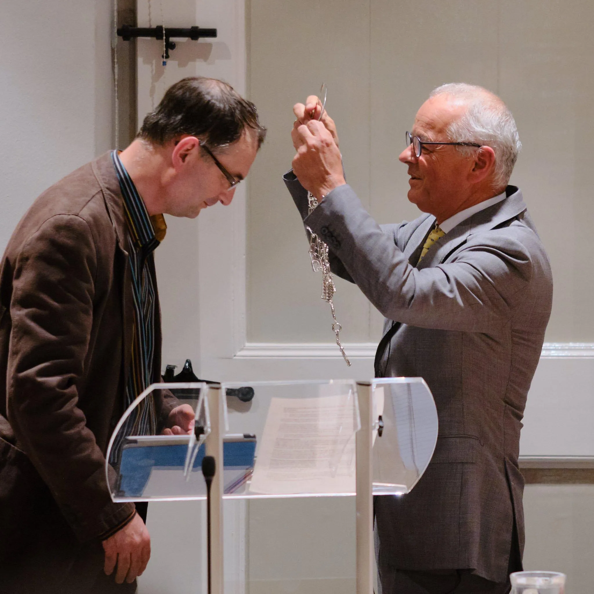 Aan het eind van de vergadering gaf Wiggers de ambtsketen aan Martin van Duinen. Vanavond zal in de raadsvergadering de keten aan de nieuwe burgemeester, Toon van Asseldonck, worden overgedragen.