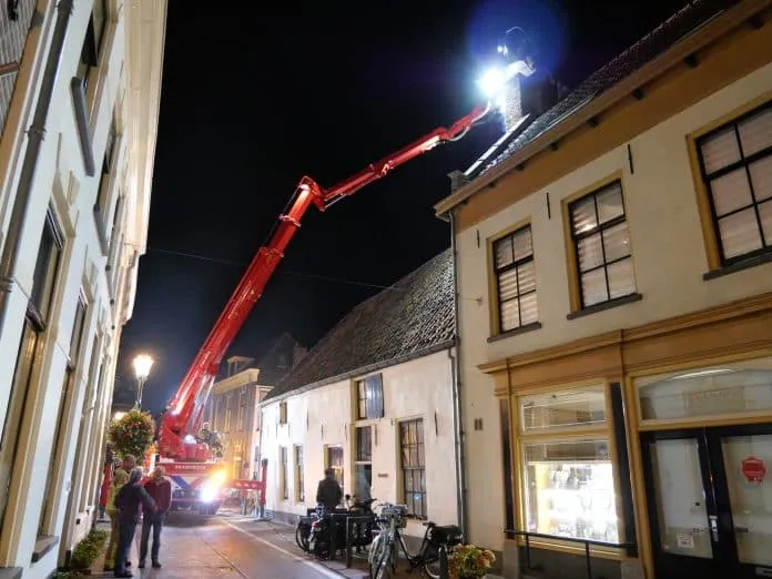 Het bleek te gaan om een schoorsteenbrand. Vanaf de ladderwagen werd de schoorsteen “geveegd” waarna de brand langzaam uitdoofde.
