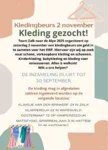 De kledingbeurs, maar ook de oliebollenverkoop in oktober, is één van de vele acties die wij dit jaar organiseren om zoveel mogelijk geld op te halen voor het KWF. Wij, dat zijn in totaal 51 personen uit Hattem, Zalk, Wapenveld en Kamperzeedijk. Op onze Facebookpagina Zalk naar de Alpe 2025 houden we iedereen op de hoogte.’