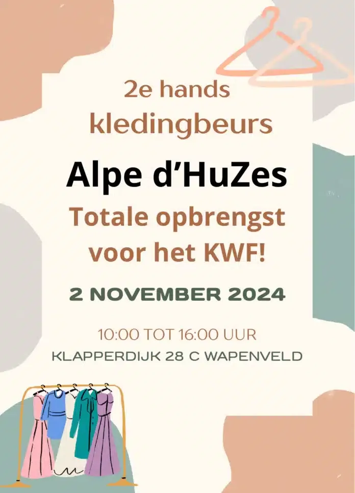 De kledingbeurs, maar ook de oliebollenverkoop in oktober, is één van de vele acties die wij dit jaar organiseren om zoveel mogelijk geld op te halen voor het KWF. Wij, dat zijn in totaal 51 personen uit Hattem, Zalk, Wapenveld en Kamperzeedijk. Op onze Facebookpagina Zalk naar de Alpe 2025 houden we iedereen op de hoogte.’