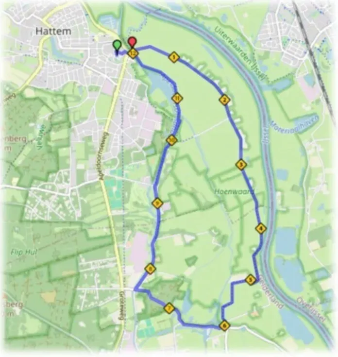 De loop is twaalf km. Vanuit de binnenstad loopt men over de Hoenwaard richting camping Het Oever, langs de Botten Strank en de Zwarte Kolk via het Kloosterbos richting Wapenveld, via het Apeldoorns Kanaal en langs de Hezenberg weer richting Hattem.