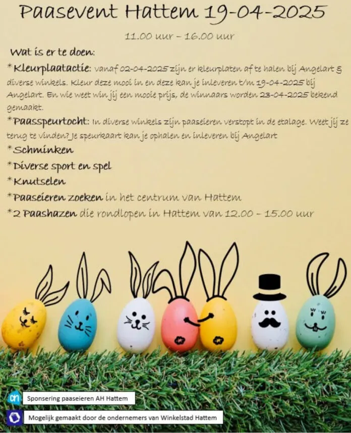 Op 19 april organiseren de Hattemse ondernemers een paasevent. Op die dag is er een paasspeurtocht, kunnen er eieren worden gezocht en worden kinderen geschminkt. Twee paashazen maken het nog gezelliger door ‘s middags tussen 12 en 15 uur door de stad te lopen.