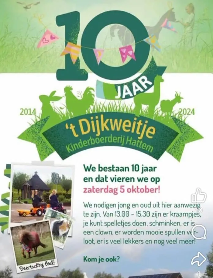Op 5 oktober viert ’t Dijkweitje haar 10-jarig bestaan. Tussen 10.00-15.30 uur zijn er kraampjes, spelletjes en er loopt een clown rond. Ook er is lekkers.