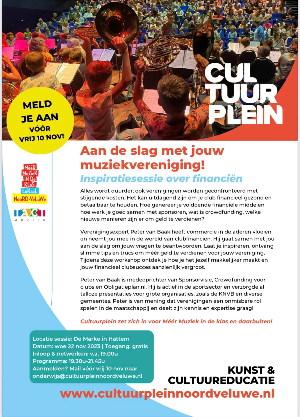 ‘Deze sessie gaat over het geld. Financiën zijn altijd een belangrijk issue bij elke vereniging. In deze sessie ga je concreet aan de slag met je eigen situatie van jouw muziekvereniging. Hoe genereer je voldoende financiële middelen en hoe kun je jouw financieel clubsucces vergroten? Deze avond organiseren we voor álle leden van muziekverenigingen op de Noord-Veluwe. We organiseren de sessie deze keer in Hattem maar ook verenigingen uit de andere gemeentes zijn van harte uitgenodigd. Kom je met meerdere leden van jouw vereniging? Graag zelfs! Er is tijdens de sessie ruimte voor het maken van nieuwe plannen en het uitwerken van concrete ideeën. Hier heb je dus gelijk profijt van! Nodig dus jouw medeleden uit! Samen bouwen we aan de toekomst van jouw muziekvereniging,’ vertelt Eva Milou Luimes, cultuurcoach bij Cultuurplein.