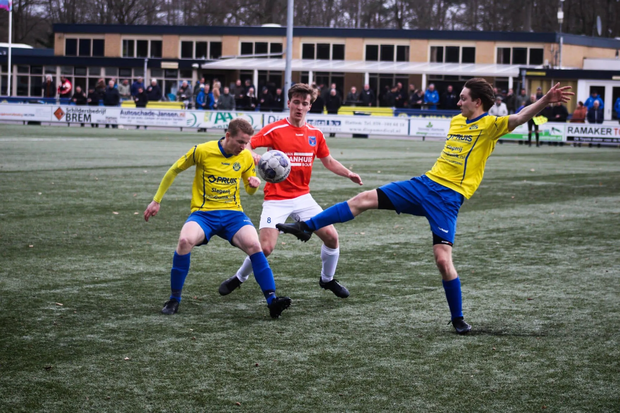 Gisteren speelde sv Hatto-Heim zijn achttiende wedstrijd, op bezoek kwam FC Horst uit Ermelo. Dat er wat op het spel stond voor beide teams was vanaf het begin af aan goed te merken. Er was veel strijd van beide kanten en het was aantrekkelijk wedstrijd om naar te kijken. sv Hatto-Heim begon voortvarend een goede voorzet van Bram Neuteboom maar daar kwam Robin van der Ziel net niet bij om gevaarlijk te worden. Een paar minuten later was het weer Bram die recht op de keeper afging, maar doelman Tim Crama van FC Horst redde knap. Twan van Rijssen en Elnathan van Dijk probeerden te scoren van afstand maar die ballen gingen hoog over het doel. Het spel speelde zich veel af op het middenveld en de ballen waren soms ook slecht onder controle te krijgen door de harde wind die dwars over het veld waaide. FC Horst hanteerde vaak de lange bal, omdat de geel/blauwen veel druk zetten op de bal. Een tegenvaller voor Hatto-Heim in de 35e minuut, aanvoerder Michel Koridon moest met een voetblessure het veld verlaten. Tijmen Neuteboom viel in en deed het ook erg goed in de verdediging deze wedstrijd. Na ruim 40 minuten speeltijd was daar de eerste grote kans voor de oranjehemden. Melle van Scherpenzeel zag zijn schot voorlangs gaan en er was geen medespeler in de buurt om het af te maken. Hierna nog een kans voor Twan van Rijssen, ook hij zag de bal voorlangs gaan. Net voor de rust nog een schot van Thijn van Wijk van Horst maar zijn inzet was een prooi voor Jorick Mensink.