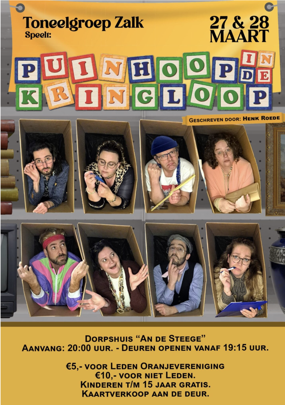 Op vrijdagavond 27 maart en zaterdagavond 28 maart voert de toneelgroep van Zalk het toneelstuk Puinhoop in de kringloop open Dorpshuis An de Steege, aanvang 20.00 uur.