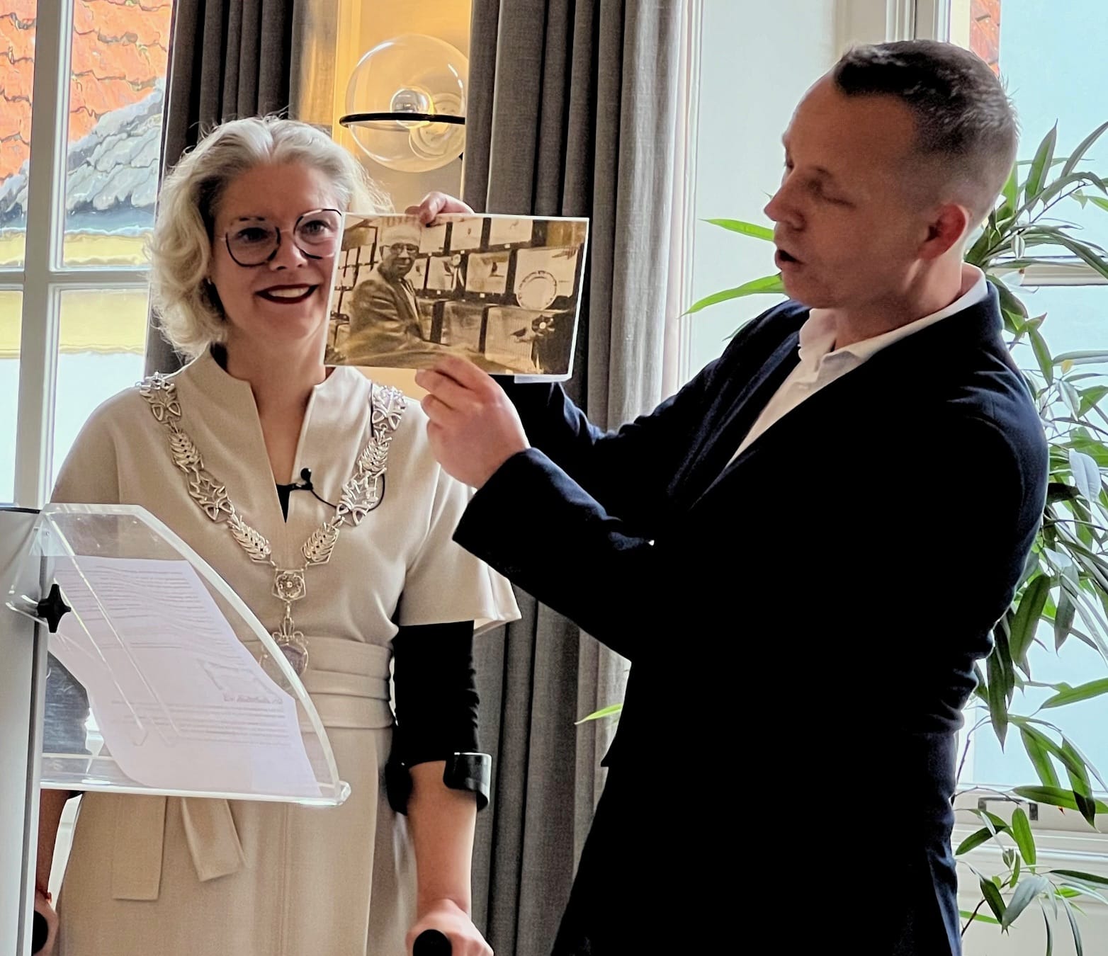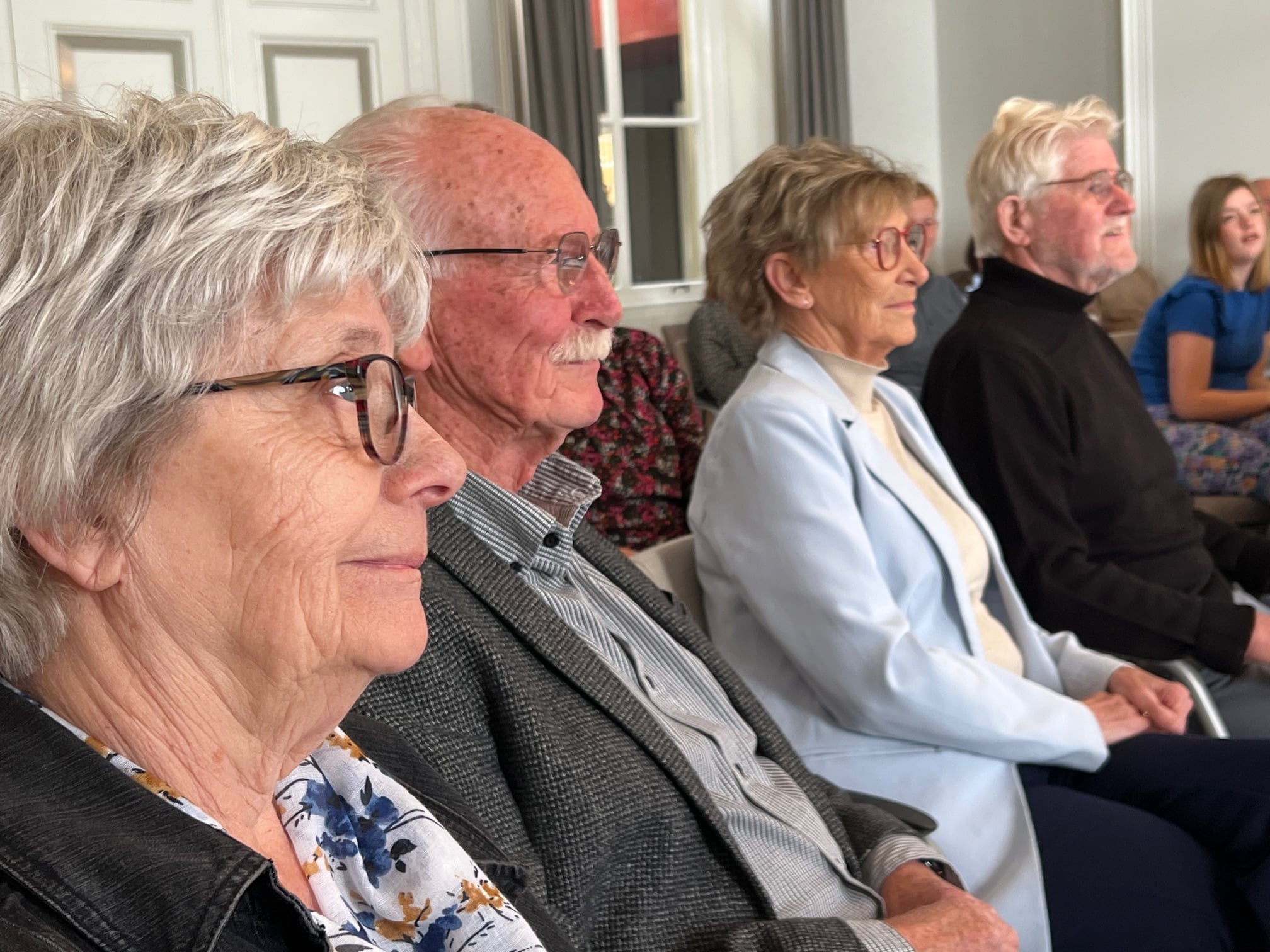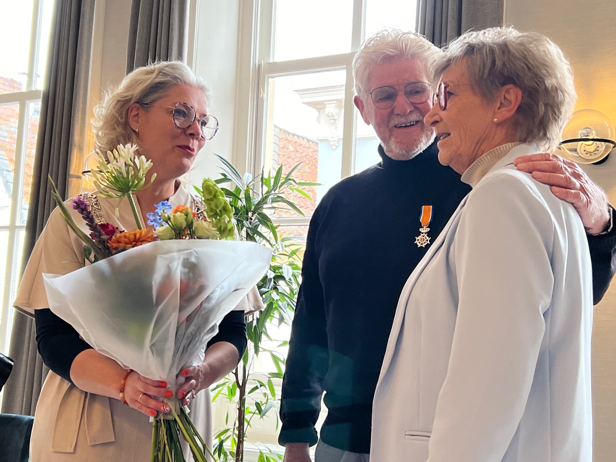 Beide heren waren compleet beduusd. Opeens stonden zij in het middelpunt. Ze waren onder voorwendselen naar het stadhuis gelokt. Toen het moment daar was, moesten hun partners als vanzelfsprekend naast hun zijn. ‘Achter elk lintje staat iemand,’ zo zei de burgemeester. Daarom kregen achtereenvolgens mevrouw Van der Worp en mevrouw Morssink een prachtig feestelijk boeket.