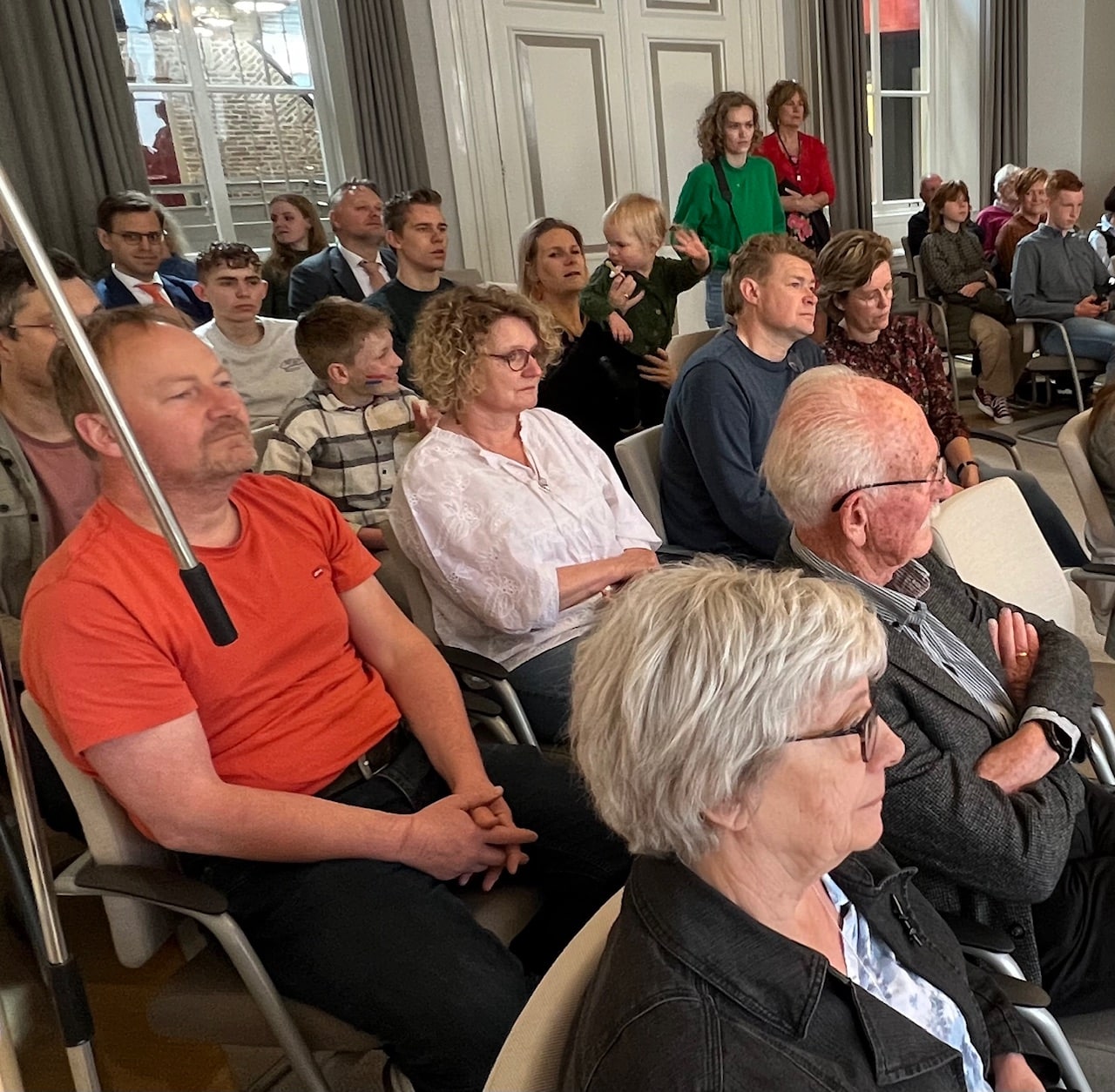 De burgemeester nodigde ook Chris Morssink uit om naast haar te gaan staan. ‘Ik neem haar gelijk mee’, waarna hij samen met zijn vrouw naar voren liep. ‘U vindt het spannend he.’ ‘Ik vind het heel spannend. Het is in de belangstelling staan, dat moet niet.’ ‘Het moet niet, maar het mag wel. Het is een indrukwekkende lijst van verenigingen en stichtingen waar u bij betrokken bent geweest of nog ben, met daarnaast sinds 2013 mantelzorger voor uw vrouw,’ aldus de burgemeester. De gedecoreerde bedankte na hét moment iedereen ‘maar in het bijzonder zij die naast mij staat. Alles was niet mogelijk geweest zonder haar. Zij deelt absoluut in deze oorkonde.’