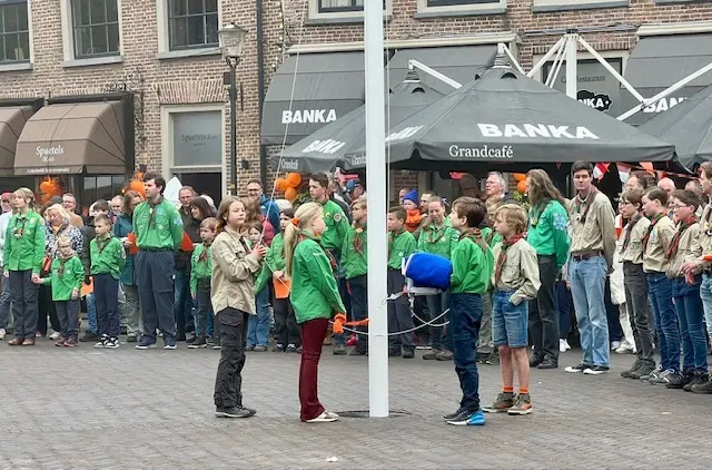 Op 26 april kwam de zon maar langzamerhand door de wolken. Tijdens de wat mistige start op de Markt hoorde je echter niemand klagen. Er werd zoals altijd meegezongen, geapplaudisseerd door de gedecoreerden, de scouting, HOV en de CMH. Ook het kleine groepje kinderen, dansend op de muziek van het Koningsspelenlied Bail bailalaa, kregen de handen op elkaar en hier en daar deed zelfs een volwassene een poging om mee te doen.