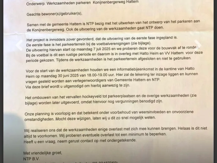 De redactie ontving 23 juni bijgesloten brief die verspreid is onder omwonenden in de omgeving van het sportpark. In de brief is te lezen, dat voor fase twee, het ombouwen van het hockeyveld tot parkeerplaatsen, nog vergunningen nodig zijn.