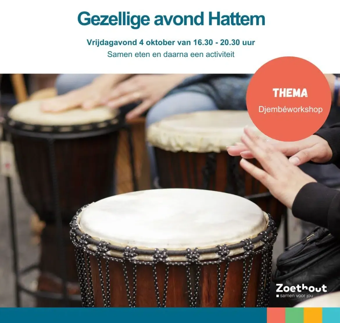 Op vrijdagavond 4 oktober organiseren Zoethout, Korak en Stichting Welzijn Hattem in de Week tegen Eenzaamheid een djembéworkshop. De workshop wordt geleid door Peter Cusiel, een ervaren djembéspeler uit Groningen. Voorafgaand aan de djembéworkshop wordt er samen gegeten.