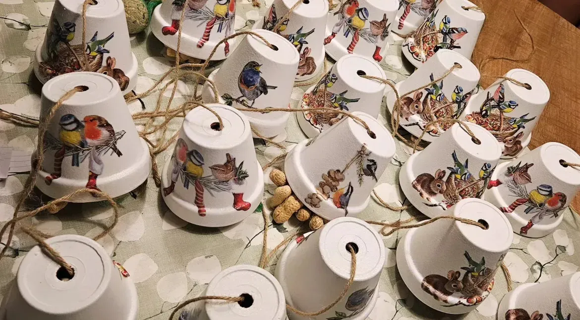 Als ze samen een hele dag er voor gaan zitten, maken ze vijftien tot twintig potjes. Noortje verft, terwijl haar moeder de figuurtjes knipt en lijmt, Daarna maakt Noortje het af door het vogelvoer eraan te hangen. Op onze vraag of ze niet helemaal gek worden van dat priegelwerk, komt er heel relaxed het antwoord: ‘Nee hoor. Juist in deze tijd is het heerlijk werk.’ Een indrukwekkende prestatie van dit tweetal.