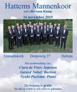 Het feestelijke lustrumconcert begint op 16 november om 19.30 uur in de Emmaüskerk aan de Dorpsweg 27 in Hattem. De zaal is open vanaf 19.00 uur. Medewerking wordt verleend door sopraan Clara de Vries, bariton Gerard Nobel en Nynke Poelsma op piano. De toegang is gratis. Na afloop is er een collecte ter bestrijding van de onkosten. Voor meer informatie: www.hattemsmannenkoor.nl