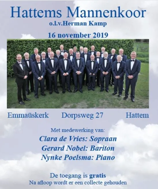 Het Hattems Mannenkoor bestaat 95 jaar. Dit jubileum wordt feestelijk gevierd met een uniek lustrumconcert op 16 november 2019 in de Emmaüskerk in Hattem. Op het programma staan liederen uit het brede repertoire van het mannenkoor van klassiek tot hedendaags.