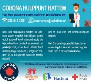 Het Corona Hulppunt is bereikbaar van maandag tot en met donderdag van 9.00 tot 12.00 uur via (038) 443 28 81 of via e-mailadres coronahulp@swhattem.nl. Vragen worden beantwoord door medewerkers van Stichting Welzijn Hattem.
