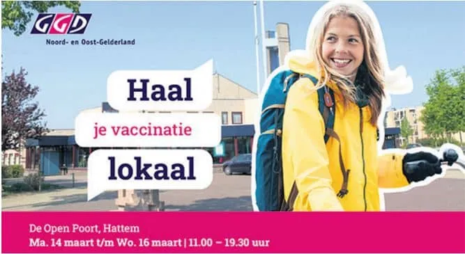 Je kunt je van maandag 14 tot en met woensdag 16 maart in De Open Poort in Hattem laten vaccineren tegen corona. Het gebouw aan de Veldhoeve 1 is hiervoor geopend van 11.00 tot 19.30 uur.