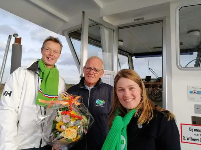 Tijdens een van de laatste veerdiensten van dit jaar van ’t Klein Veer kreeg schipper Teekman een bloemenhulde van het CDA Zwolle en Hattem.