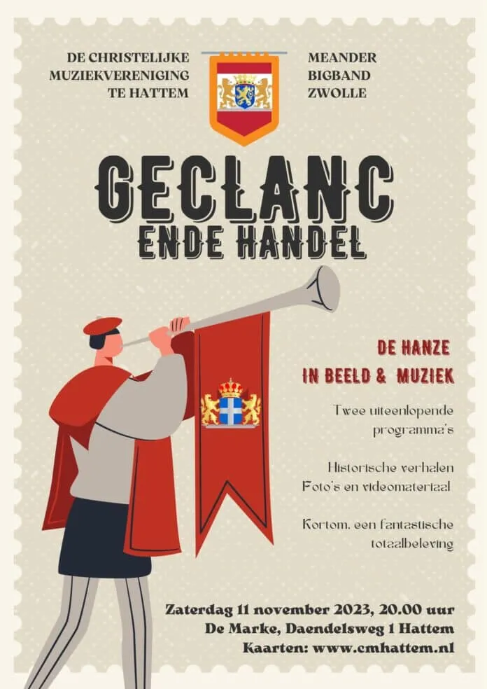 De Christelijke Muziekvereniging te Hattem organiseert op 11 november een concert in samenwerking met de Meander Bigband uit Zwolle. De Hanze staat synoniem voor handel en uitwisseling en daarom heeft de CMH dit georganiseerd in het kader van het Hanzejaar onder de noemer Geclanc Ende Handel. Een avond vol muziek en verhalen omlijst met beelden. Kaarten à €5,- in de voorverkoop zijn nu al te bestellen via www.cmhattem.nl waar ook meer informatie te vinden is over de inhoud.