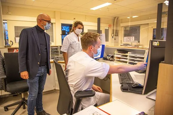 Myrna de Man, coassistent in Isala, bezoekt de patiënten thuis voorafgaand aan de monitoring en geeft uitleg over de saturatiemeter. ‘Ik neem de saturatiemeter mee, een beschermde telefoon met app en een apparaat dat de gegevens van de telefoon meteen doorstuurt naar het monitoringscentrum in Meppel. De eerste meting doe ik samen met de patiënt. Daarna bel ik met het monitoringscentrum om er zeker van te zijn dat de gegevens goed doorkomen. Ook neem ik nog een PCR-test af. Het is de bedoeling dat patiënten vier keer per dag hun saturatie doorgeven. Stel wij zien dat het slechter gaat, dan kunnen wij vragen om ieder uur de saturatie door te geven. En gaat iemand echt achteruit, dan krijgt de huisarts een seintje. Omdat COVID erg onvoorspelbaar kan verlopen, is het belangrijk om vooral risicopatiënten goed in de gaten te houden. En natuurlijk moeten mensen ook zelf aan de bel trekken als het opeens veel slechter gaat.’