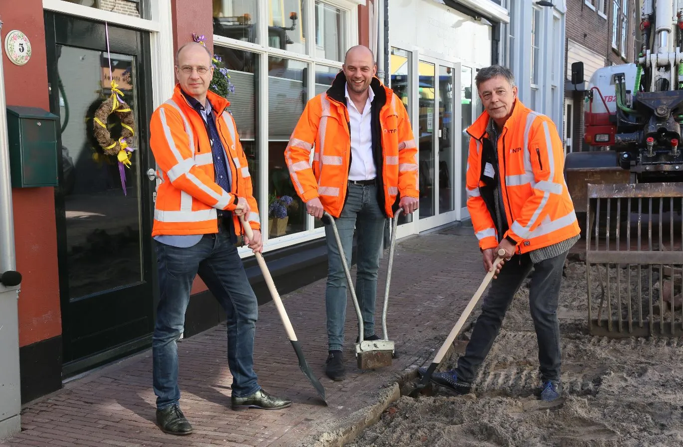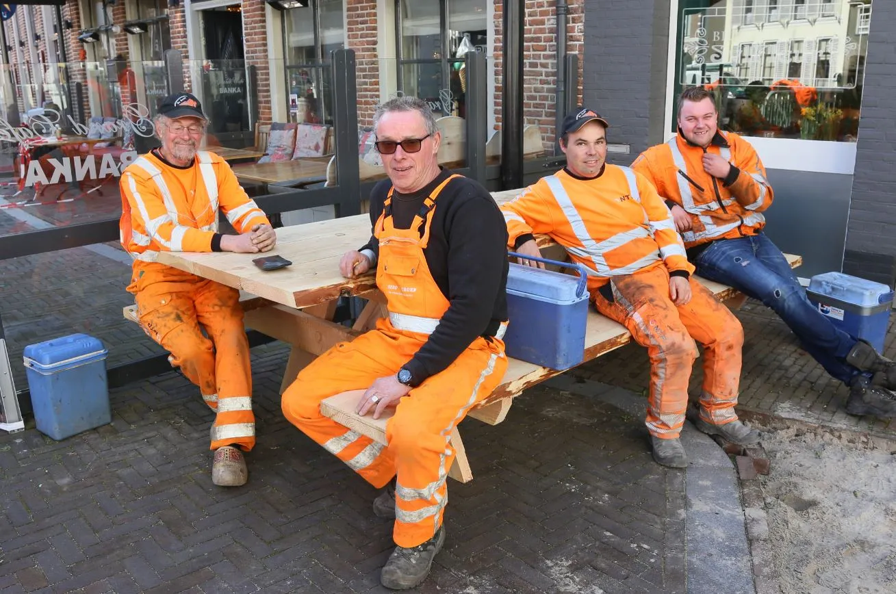 In de eerste stap werkt NTP tot 23 april in de Kerkstraat. Er wordt gewerkt vanaf de Markt tot aan de 3e Walsteeg. Tijdens deze werkzaamheden blijven winkels en woningen in de binnenstad goed bereikbaar via kunststof loopschotten langs de gevels. Op deze foto de mannen die ‘het echte werk doen’ .