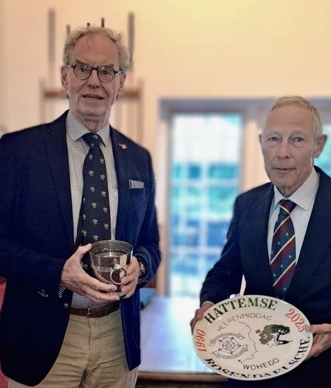 Jaarlijks is er een wedstrijd tussen heren van de Hattemse Golfclub en die van de Rosendaelsche Golflub (bij Arnhem), die nu al toe is aan de 32e editie. Deze uitwisseling is begonnen in 1990, maar door corona en ondergelopen banen zijn een paar jaar uitgevallen. Afwisselend wordt op elkaars baan gespeeld en dit jaar was Hattem aan de beurt. Ondanks het sterke team dat de Rosendaelsche opstelde, was de overwinning op 24 september toch voor de Hattemse heren met 38 tegen 28. Daarmee kwam de totaal stand op 16 overwinningen van elk van de clubs, dus de heren houden elkaar mooi in evenwicht. De Rosendaelsche heren werden na afloop getroost met een mooie schotel, speciaal gemaakt door één van de Hattemse heren. Op de schotel naast de logo’s van beide verenigingen ook een verwijzing naar de IJssel, die ons beiden verbindt. Het geheel werd natuurlijk afgesloten met een koele borrel en warm buffet, dat de heren zich goed lieten smaken.