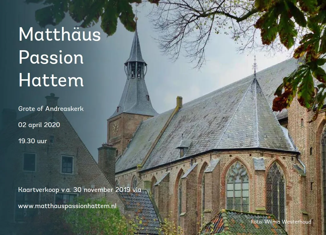 Zaterdag 30 november om 10.00 uur begint de voorverkoop van de kaarten. Meer informatie is te lezen op de website www.matthauspassionhattem.nl . De uitvoering vindt plaats op donderdag 2 april 2020 in de Grote of Andreaskerk te Hattem. Aanvang 19.30 uur.
