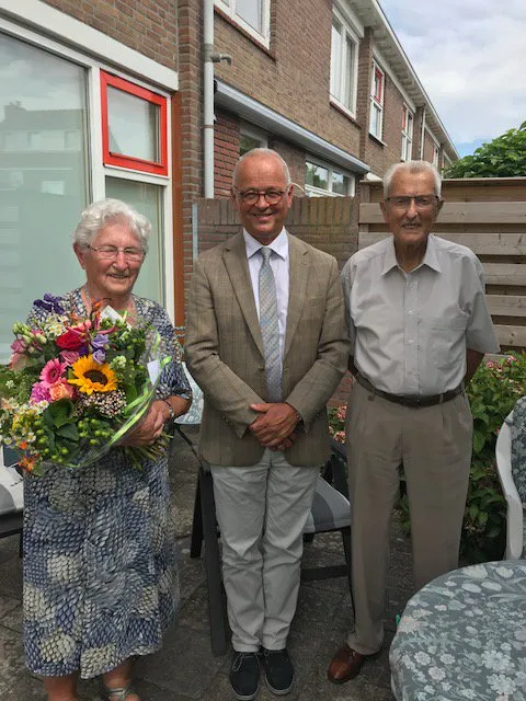 De heer en mevrouw Schoonhoven-De Haan waren op 23 juli 65 jaar getrouwd. Burgemeester Jan Willem Wiggers bracht hen vandaag thuis een bezoek om hen te feliciteren met dit Briljanten jubileum.