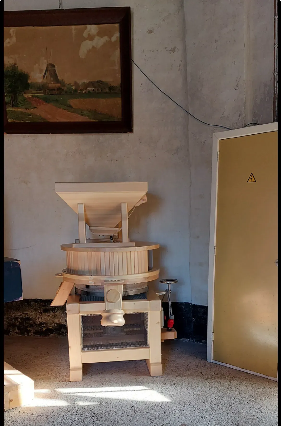 Gerben van Gelder legt uit wat een maalstoel is en doet: ‘De maalstoel, of de elektrisch aangedreven maalkoppel genoemd, bestaat uit twee molenstenen waarvan de bovenste door een elektromotor wordt aangedreven. De stenen liggen op een houten bok in een kuip met daarboven een trechter waar de te malen tarwe in gaat. Â Aan de zijkant zit een korte meelpijp waar we de zakken onder kunnen plaatsen om het meel in op te vangen dat tussen de stenen vandaan komt. De molenaars kunnen met dit elektrische maalkoppel straks zelf tarwe en soortgelijke granen malen voor de streekwinkel.’
