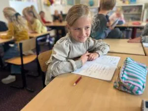 Voordat we konden beginnen, werd het rekenwerk afgemaakt. Na het sein ‘Rekenschriften opruimen en pak je schriftje van vanmorgen’ zaten de kinderen klaar. Met de juf lezen ze het boek De zoete zusjes houden van Holland, een reis door alle provincies en tijden. In hun werkschrift hadden ze zich die ochtend voorbereid door op te schrijven wat ze wilden vertellen. Dat leverde verhalen op over de Efteling, over ‘boeren die toen nog geen boerderij hadden maar mijn vader nu wel’, over stroopwafels, fierlejeppen en klompen. Maar het avontuur was meer dan het boek, zo bleek na doorvragen. Het was de angst tijdens de vakantie voor het gevaar dichtbij de caravan en tent, een meegemaakte brand, helemaal naar Maastricht rijden en dingen zien die je nog niet eerder hebt gezien, of onderweg op vakantie hertjes en vosjes ontdekken.