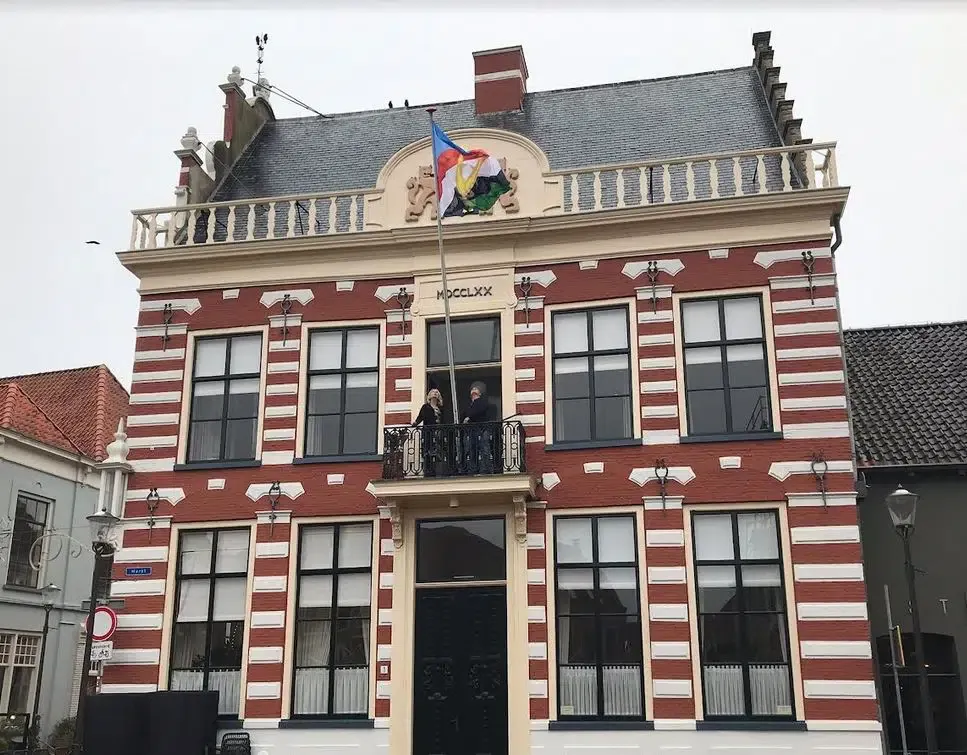Samen met veteraan Fred Otsen hees burgemeester Sanderse de veteranenvlag op het balkon van het stadhuis als aftrap van de Hattemse Veteranendag. Deze vlag hangt sinds vorig jaar uit het stadhuis op de landelijke veteranendag in juni en nu voor het eerst op de lokale veteranendag.