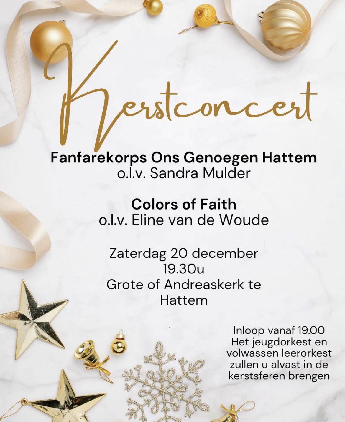 Fanfarekorps Ons Genoegen heeft op 20 december in de Grote of Andreaskerk een kerstconcert samen met Colors of Faith. Het begint om 19.30 uur.