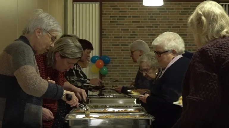 ‘Ik kom hier al tien jaar elke week.’ Een vrouw staat met haar bordje in de rij voor het stamppottenbuffet. ‘Anders zit ik ook maar in mijn eentje thuis. Hier is het heel gezellig, we lachen heel veel met elkaar.’ Achter haar roept een andere vrouw een grap naar haar. ‘Zie je wel, nou lachen ze mij al uit omdat ik met jou sta te praten. Ik zal snel eten pakken.’
