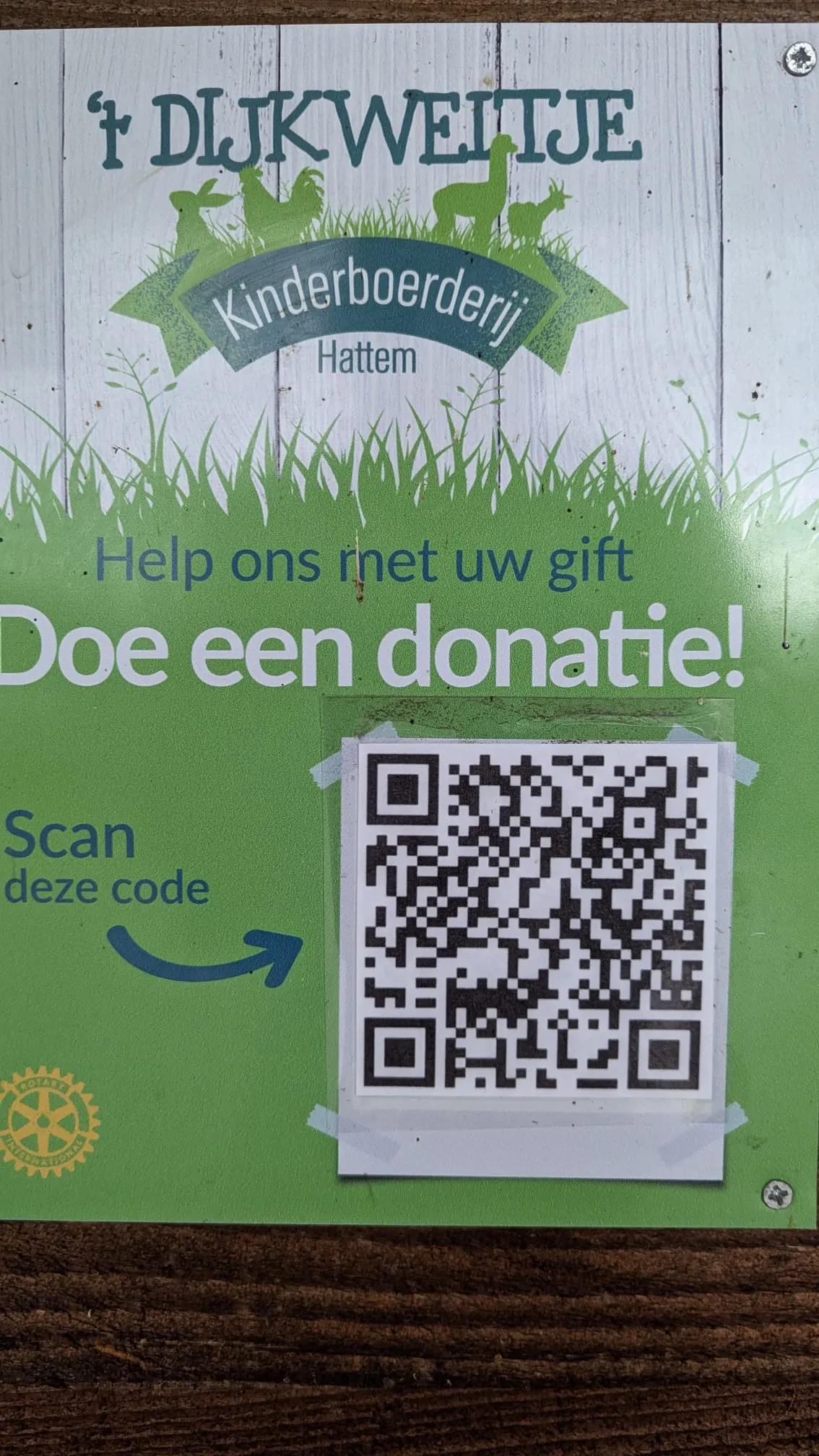 Er zijn gelukkig ook andere manieren om de Dijkweitje-dieren een gevulde maag te bezorgen. Via een op de stal aangebrachte QR-code kan een gift worden overgemaakt naar de kinderboerderij. Die werkt ook vanaf de foto onder dit bericht.