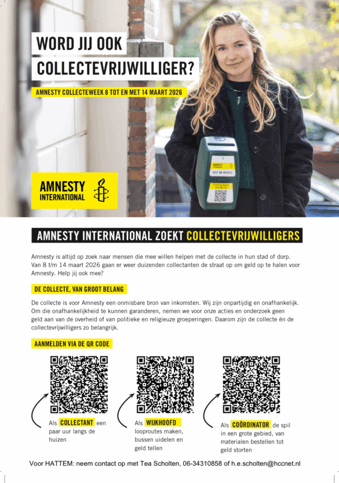 Van 8 tot en met 14 maart wordt de jaarlijkse collecteweek van Amnesty International gehouden. Coördinator Tea Scholten zoekt vrijwilligers: ‘Collecteren is een laagdrempelige activiteit waarbij je bijdraagt aan de bescherming van mensenrechten wereldwijd. Amnesty zet zich onafhankelijk in voor mensen die onterecht vastzitten, worden bedreigd of gemarteld. Vrijwilligers kunnen een paar uur in hun eigen wijk collecteren, op de woensdagmarkt of bij een vereniging.’