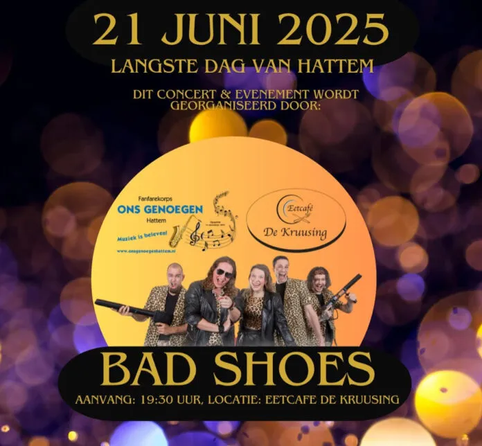 Op de langste dag van het jaar, 21 juni, hoopt muziekvereniging Ons Genoegen met hun programma Bad Shoes te knallen. Dit evenement wordt samen met eetcafé De Kruusing op de kruising Kruisstraat/Ridderstraat/Achterstraat georganiseerd, van 19.30-00.00 uur.