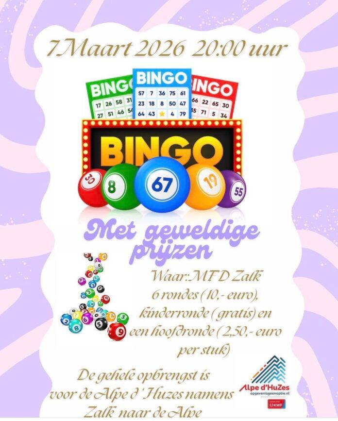 Onder het motto ‘opgeven is geen optie’ beklimt het team Zalk naar de Alpe op donderdag 4 juni de Alpe d’Huez. Om zoveel mogelijk geld mee te nemen voor onderzoek naar kanker en naar verbetering van de kwaliteit van leven van mensen met kanker, organiseert het team verschillende activiteiten. Op 7 maart wordt er in MFD Zalk bingo gespeeld. Aanvang 20.00 uur.