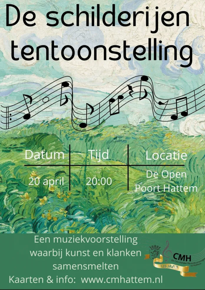 Op zaterdag 20 april komen alle schilderijen die Hattemer kunstenaars hebben gemaakt tot leven. In de aanloop naar dit concert zijn diverse gratis schilderworkshops gegeven om mensen die niet zo snel met kunst en muziek in aanraking komen, een podium te geven. De schilderijen die gemaakt zijn, zijn gebaseerd op de verschillende delen van het muziekstuk De Schilderijententoonstelling van Mussorgski.