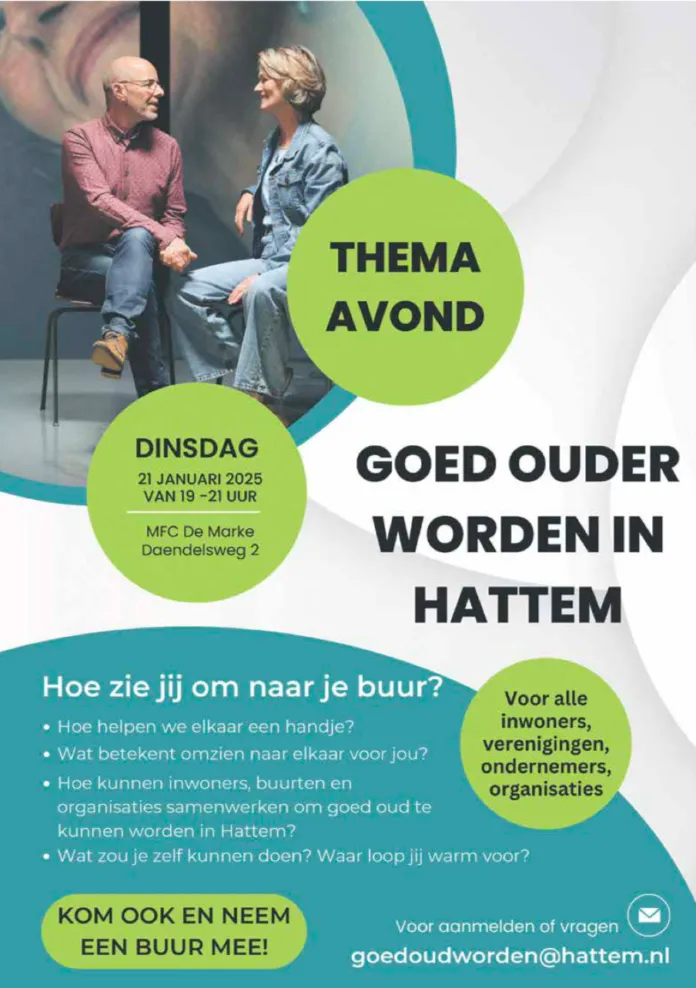 Op dinsdag 21 januari organiseert de gemeente een tweede bijeenkomst voor inwoners, ondernemers, vrijwilligers en zorg- en welzijnsorganisaties over Goed ouder worden in Hattem. De bijeenkomst richt zich op het gezamenlijk vormgeven en verwezenlijken van een samenredzame gemeenschap in Hattem.