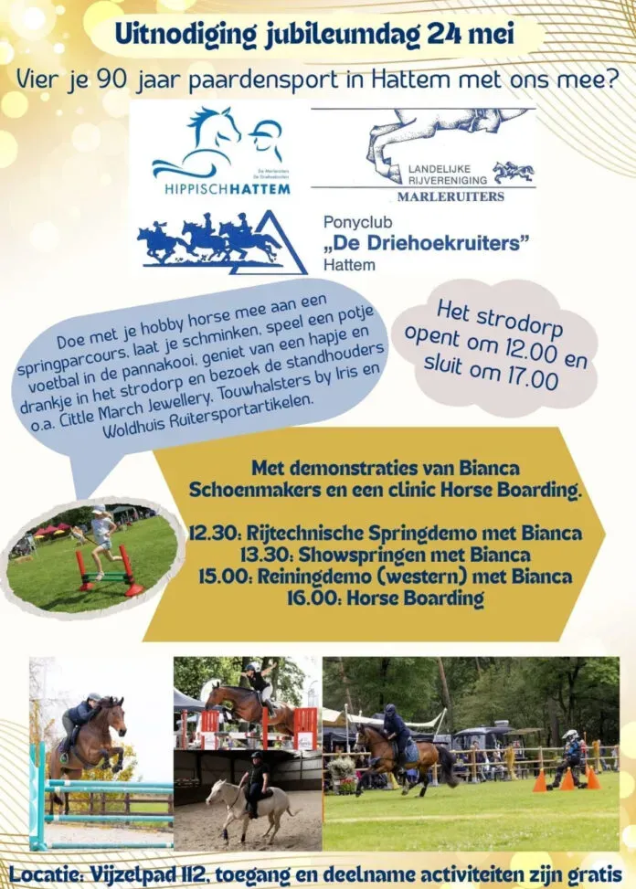 Op zaterdag 24 mei viert Hippisch Hattem haar 90-jarig jubileum op Vijzelpad 112. Het middagprogramma, dat voor iedereen gratis toegankelijk is, start om 12 uur met de bekende internationale springruiter Bianca Schoenmakers. Zij verzorgt om 12.30 uur, 13.30 uur en 15.00 uur spring- en westerndemo’s.