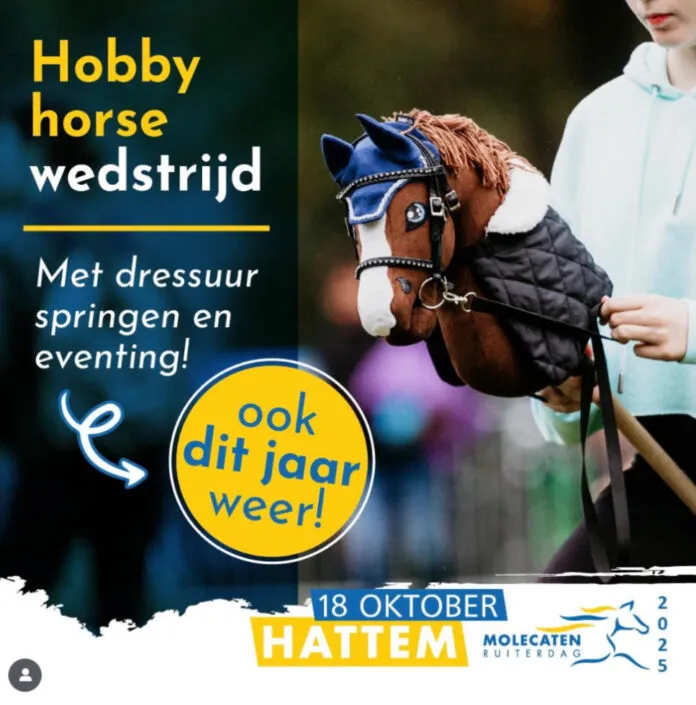 Tijdens de Molecaten Ruiterdag kunnen kinderen niet alleen genieten van de grote paarden, ze kunnen ook beleven wat het is om zélf een eventing-wedstrijd te rijden. Er wordt zaterdag 18 oktober namelijk weer een hobbyhorse-wedstrijd georganiseerd, compleet met dressuur, springen èn een crosscountry. Vorig jaar deden er zestig deelnemers mee.
