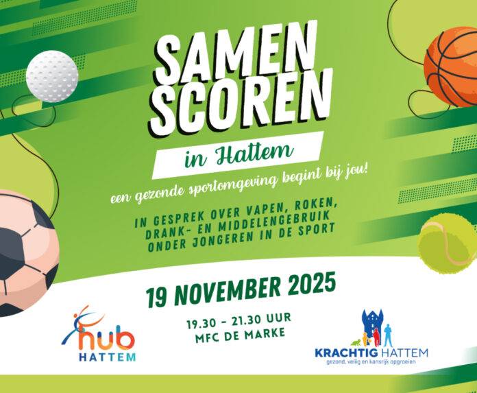 Hattemse sportverenigingen en de gemeente organiseren op 19 november de informatieavond Samen scoren: een gezonde sportomgeving begint bij jou! om aandacht te vragen voor vapen, roken en middelengebruik onder jongeren. De bijeenkomst richt zich op bestuurders, trainers, vrijwilligers en ouders en biedt praktische tips, een lezing over pubers van nu, een quiz over middelenkennis en ruimte om ervaringen uit te wisselen.