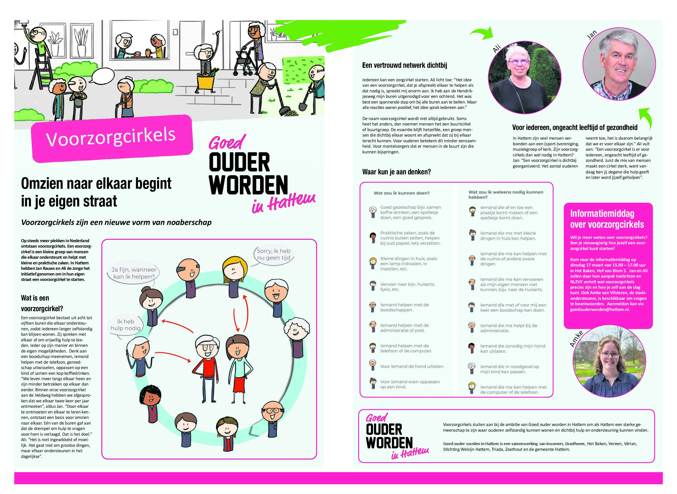 In Hattem zijn inmiddels de eerste voorzorgcirkels gestart. Jan Rauws en Ali de Jonge begonnen een cirkel in hun eigen straat. Zij merken dat buren elkaar nu sneller weten te vinden en dat de drempel om hulp te vragen lager wordt. Rauws: ‘Door elkaar te ontmoeten en elkaar te leren kennen, ontstaat een basis voor omzien naar elkaar.’