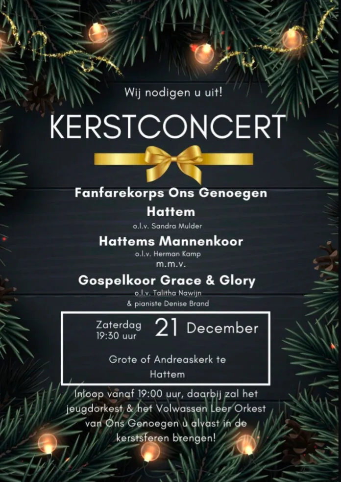 Op 21 december verzorgt Ons Genoegen samen met het Hattems Mannenkoor en het Zwolse gospelkoor Graise & Glory een kerstconcert in de Grote of Andreaskerk, aanvang 19.30 uur.